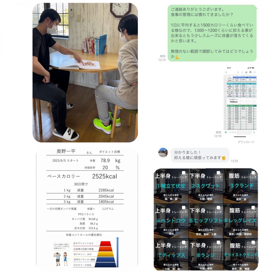 週に1回のペースで通い、自宅でも出来るトレーニングの方法やダイエットをするための基本的な知識、日常生活で気を付けないといけない点を教えてもらいました。食事についてはLINEで私が食べた内容を奥野さんと共有しながら、改善点や修正点をストレスにならないように気を付けながら提案してもらえました。
