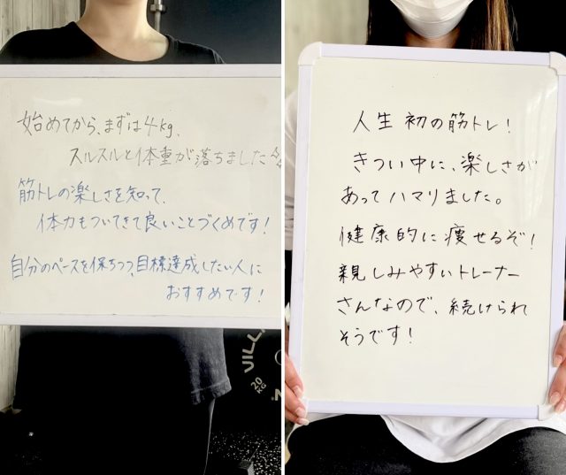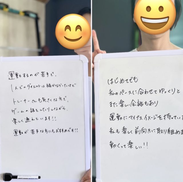 トレーニングは初めてだったので出来るかどうか不安でしたが、私の体力や骨格、身体の使い方の癖などを把握したうえでメニューを組んでもらえたし、しっかりと筋肉に効かせられるようにフォームを丁寧に教えてもらえたので運動が苦手な私でも継続することが出来ました。